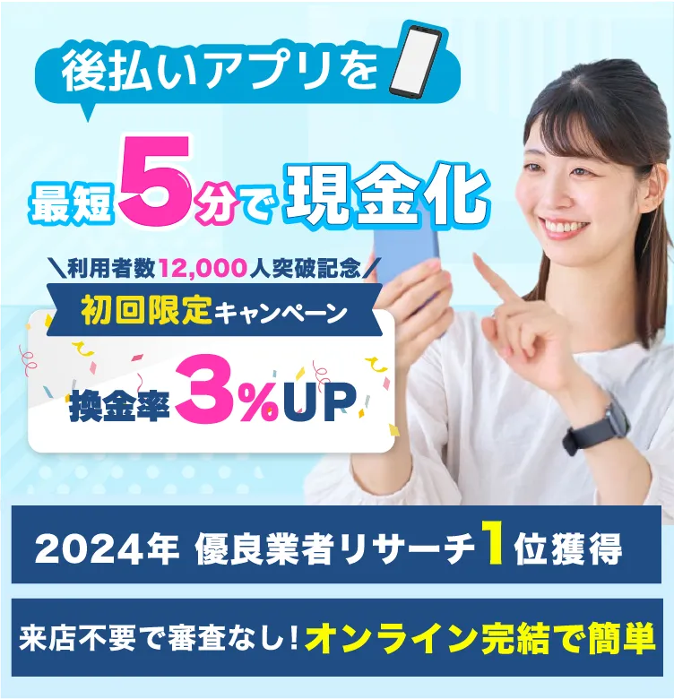 お客様がお持ちの後払いアプリ(メルペイなど)の限度額までの範囲であれば、おいくらでも現金化が可能です。